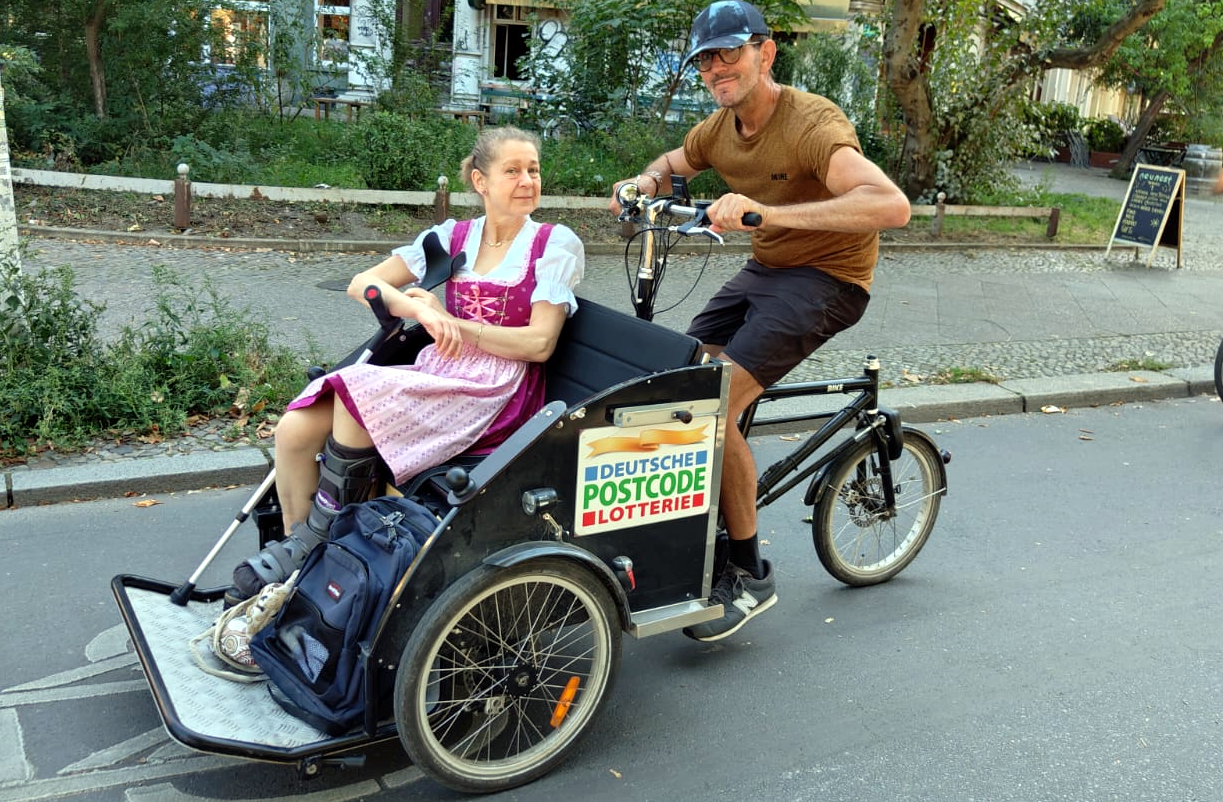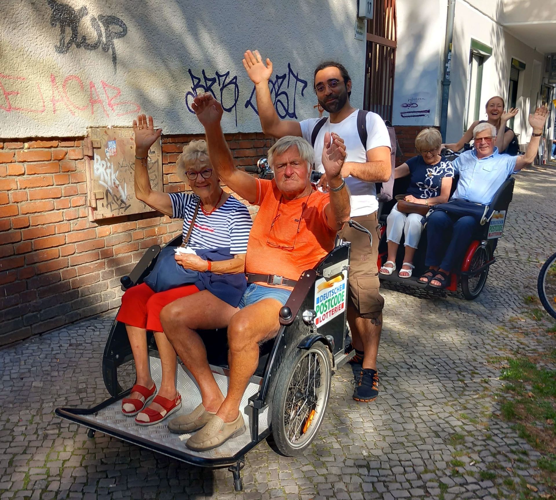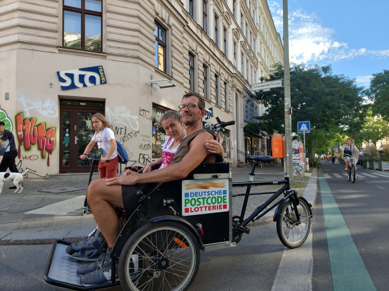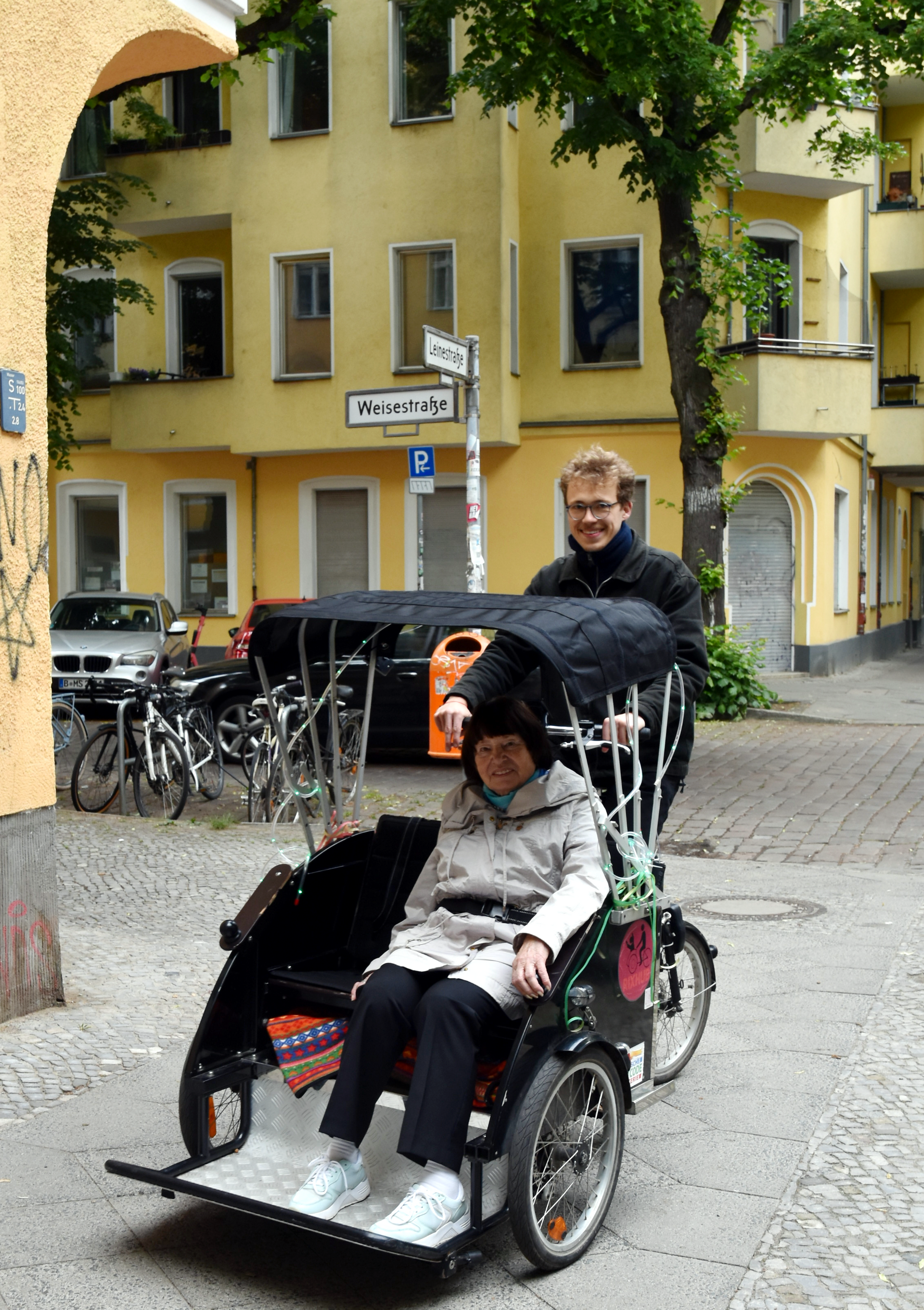 Der Gratulationsdienst Neukölln ist am Start: alles klar für die Rikschatour zum 91.Geburtstag - mit dem Rikscha-Lotsen Fynn am Steuer